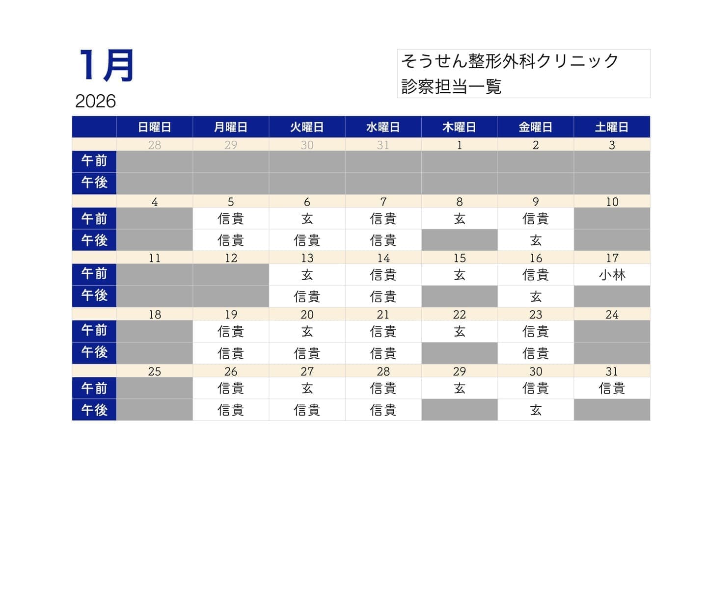 2026年1月の外来診療担当一覧です。