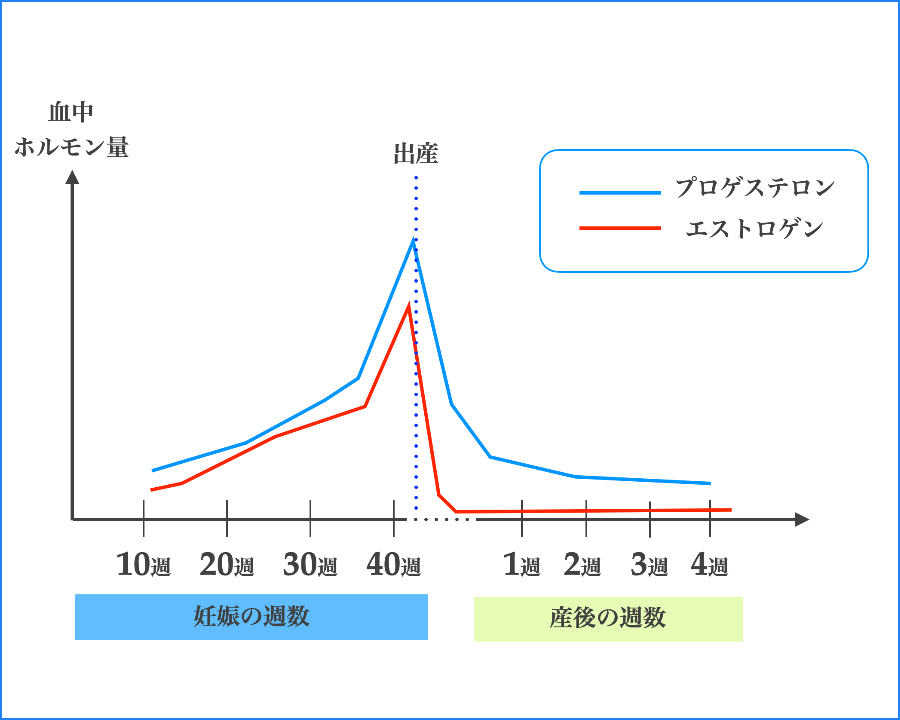 妊娠中と出産後は女性ホルモン(特にエストロゲン)が図のように急激に変化します。出産後に一気に0近くまで低下するため、体の代謝にも大きな変化を及ぼします。