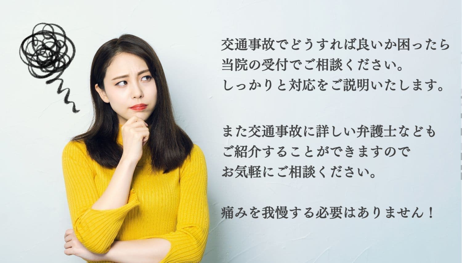 その場合は交通事故に詳しい弁護士を紹介いたしますので、ご遠慮なく医師やクリニック受付にご相談ください。