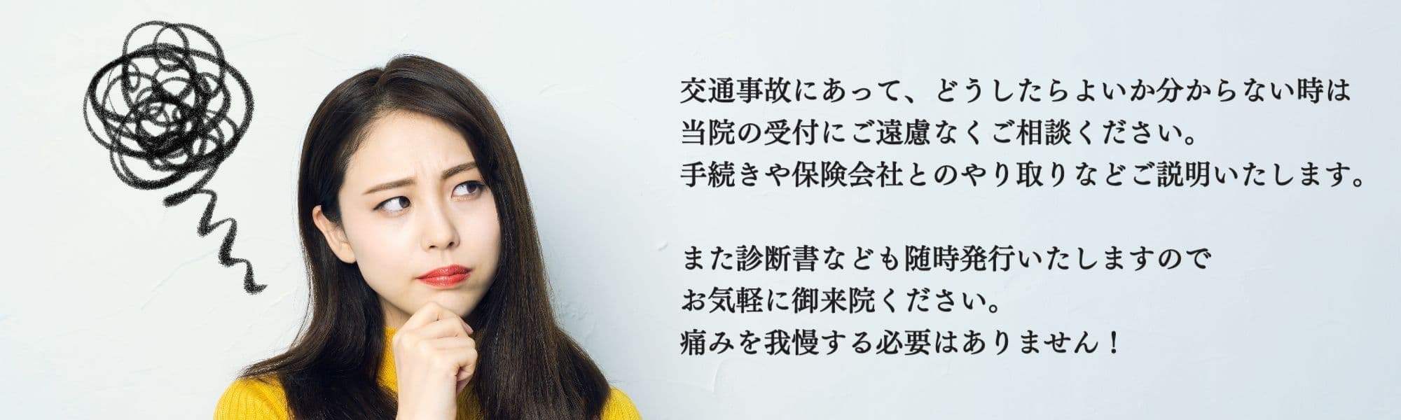 交通事故に遭遇した場合、何をしたらいい?どこで治療を受けたらいい?など非常に困ることが多いです。よくわからないまま適当に整骨院などに受診して症状が改善しなかったり保険会社とトラブルになることも多いと聞きます。