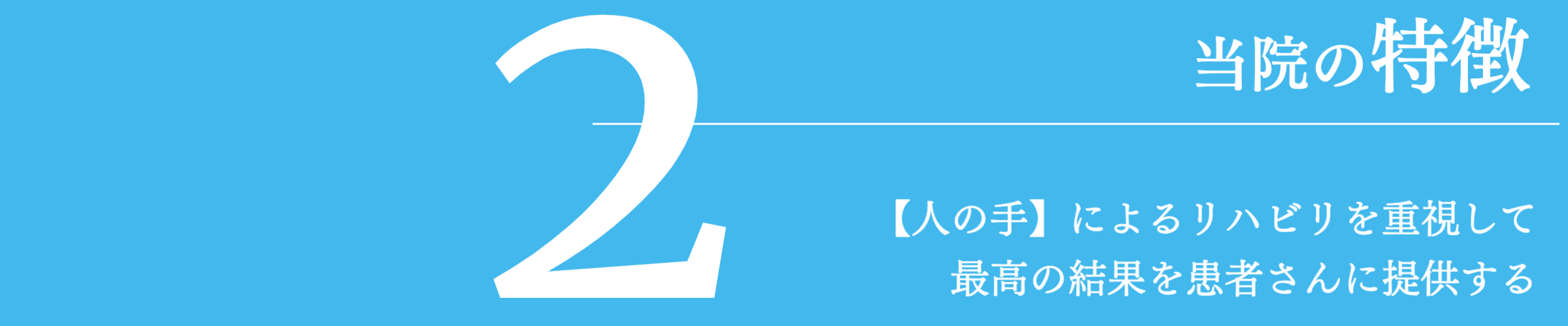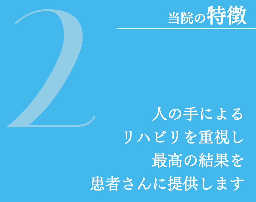 当院は機械に頼りすぎずに人の手によるリハビリテーションを重視しています。微妙な手応えの差を感じ取りベストな方法でリハビリを提案していきます。またうまく行かない時は検討を重ねて方針を改めて決定することで改善する事を徹底的に目指します。